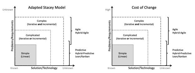 Timing is also an important factor. Blending approaches (Hybrid) based on project type and phase is a common practice. For some types of projects, the cost of change may initially be low, but at a certain point, it becomes prohibitive.